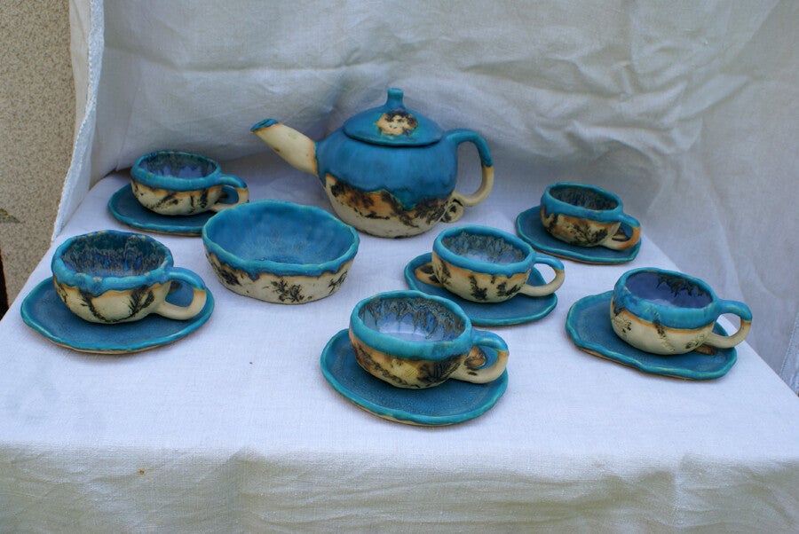 Zastawa ceramiczna całkowicie ręcznie wyklejana 15 częściowa ,zestaw z kamionki wypalony w temperaturze 1340 stopni,niepowtarzalny jedyny taki drugiego takiego samego już nie będzie, filiżanki o pojemności pomiędzy 250-270ml.,dzbanek o pojemności 1500 ml.